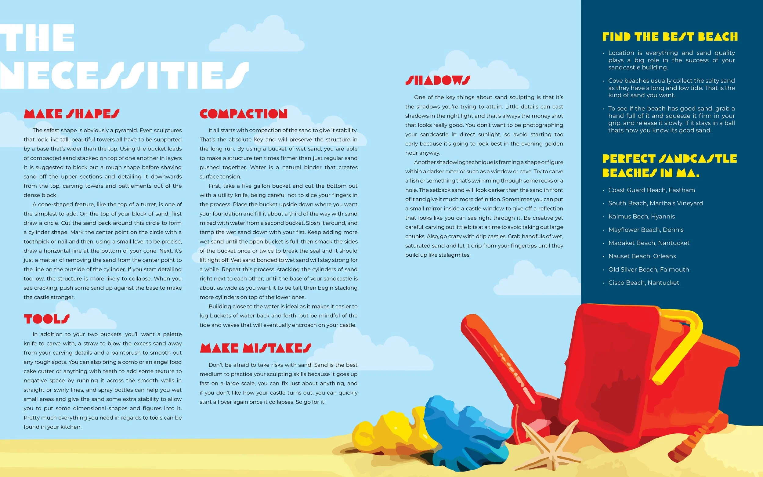 This two page magazine spread provides you with all of the information you need to know to build a sandcastle like a pro. The information within the magazine goes in depth to guide you in building professional sandcastles and also average sandcastles you can make by using the simplest tools. The color palette and typography was chosen wisely to represent the feelings behind what it’s like building a sandcastle and hopes to leave the viewer feeling inspired to create!